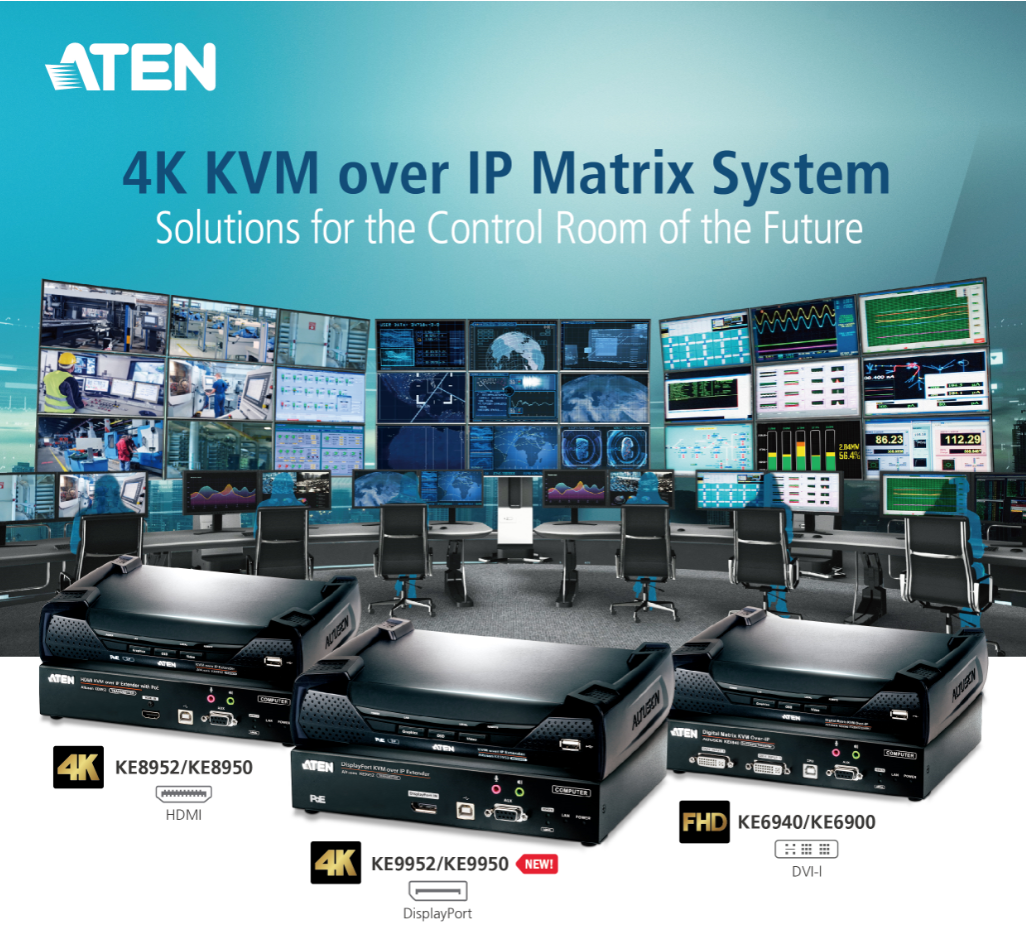 Sydney, Australia (June 19, 2019) – ATEN ANZ, the leading provider of AV/IT connectivity and management solutions in the ANZ region, recently announced the newest additions to its KE Series of KVM over IP Extenders – the KE9950/KE9952, which supports DisplayPort video resolutions up to 4K, and the KE6910/KE6912, which is tailored for the Air Traffic Control (ATC) industry. With the release of these two new models, ATEN’s KVM over IP Matrix System product range now not only supports the most popular video interfaces (DisplayPort, HDMI, and DVI) to fulfill demands from most control room environments, but also provides advanced features and functionalities for the specific demands of 24-7 ATC environments.