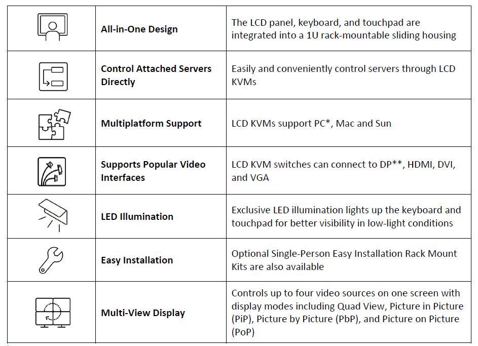 - Integrated LCD KVM console with an 18.5'' LED-backlit widescreen LCD monitor in a single rail housing with top and bottom clearance for smooth operation in a 1U high system rack