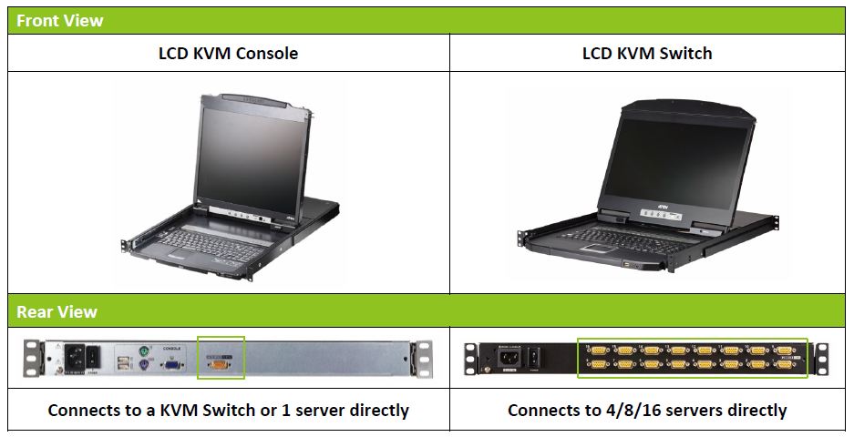 | Power | 1 x KVM Console (Dark Green) 1 x LCD (Orange) |