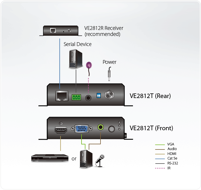 - Compatible Receivers – VE2812R, VE1812R, VE811R, VE814AR, VE801R, VE802R, VE601R, VE901R, or future ATEN HDBaseT Receivers
