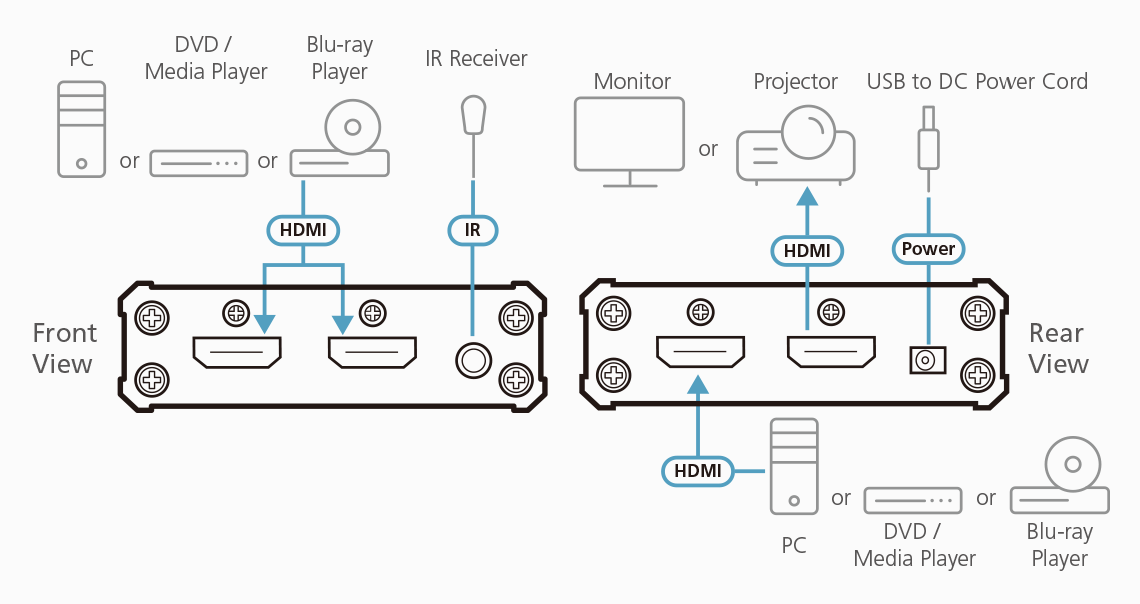 • Switching between HDMI input sources via front panel pushbuttons and IR remote control
