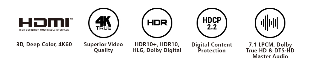 • HDMI (3D, Deep Color, 4K, HDR10+, Dolby Vision, HLG); HDCP 2.2 compliant