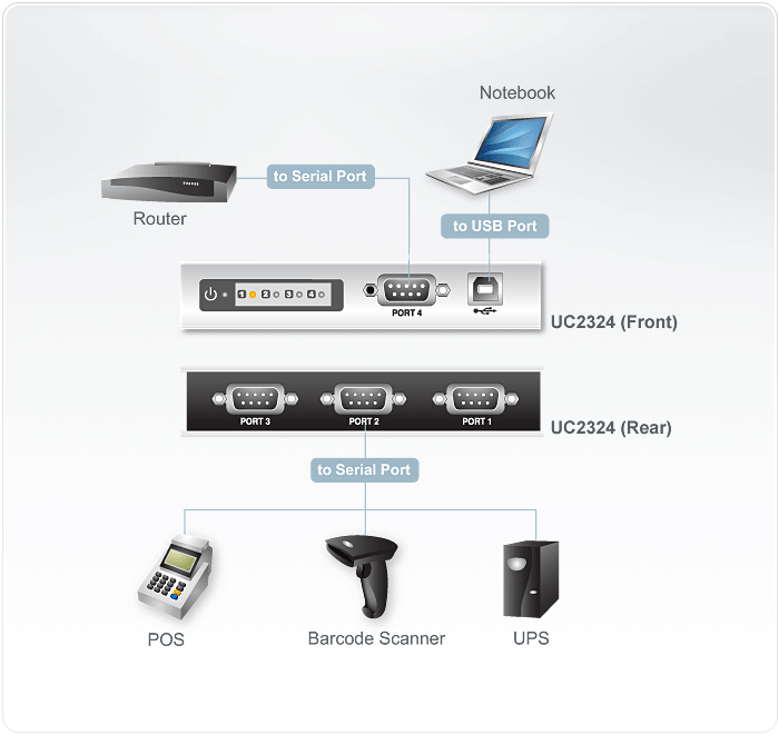 The ATEN USB-to-Serial RS-232 Hub provides an external plug-and-play RS-232 serial connection for computers, notebooks, laptops, and handheld computing devices that support the USB specification. It provides a quick, simple, and cost-effective solution and is ideal for various communication and automation applications.