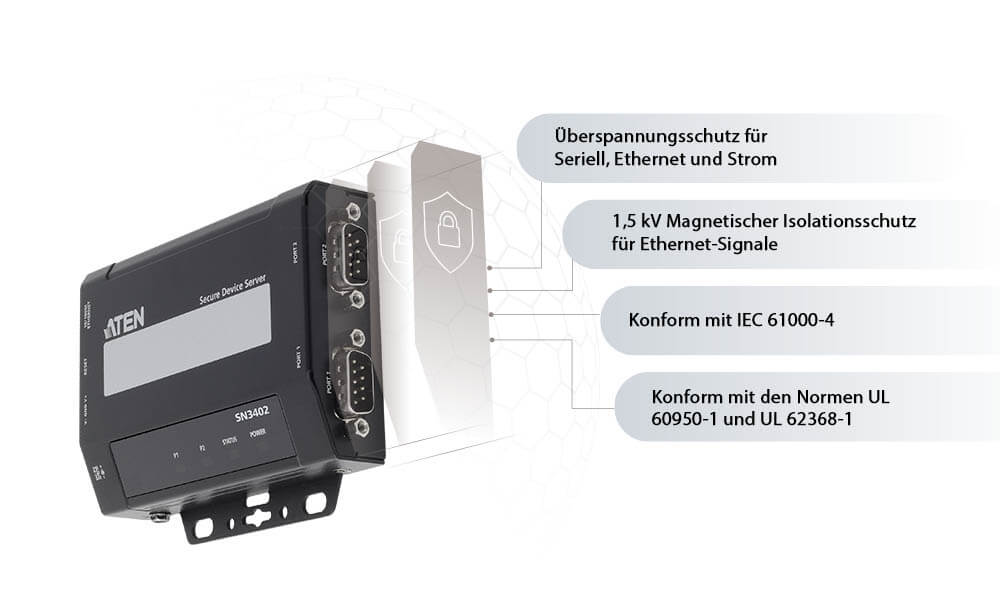 - Überspannungsschutz für Seriell, Ethernet und Strom