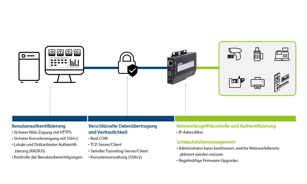 Die wachsende Zahl von Cyberangriffen im Zeitalter des industriellen IoT hat das Potenzial, Systeme zum Absturz zu bringen und enorme Zeit- und Geldverluste zu verursachen. Um potenzielle Sicherheitsrisiken zu vermeiden, benötigen Unternehmen ein mehrschichtiges Verteidigungssystem, um eine sichere Datenübertragung zu gewährleisten. Dazu gehören regelmäßige Firmware-Upgrades sowie verschiedene verschlüsselte Formen der Authentifizierung und Zugriffskontrolle. Die sichere Seriell-zu-Ethernet-Lösung SN3402 ist mit Sicherheitsfunktionen auf jeder Ebene ausgestattet, einschließlich Netzwerkzugangskontrolle und Benutzerauthentifizierung, Datenintegrität und Vertraulichkeit. Darüber hinaus steht ein Betriebsmodus für erweiterte Sicherheitsfunktionen zur Verfügung, mit dem Sie alle erforderlichen Felddaten erfassen und den Schutz an vorderster Front gewährleisten können.