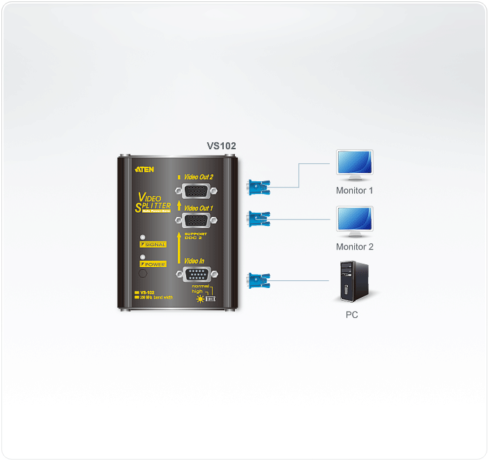 Der Grafik-Splitter VS102 leitet das Grafik-Eingangssignal an 2 Ausgänge mit je 250 MHz weiter. Außerdem können Sie das Grafiksignal mithilfe des Gewinnreglers verstärken, sodass Übertragungswege von bis zu 65 m möglich sind.