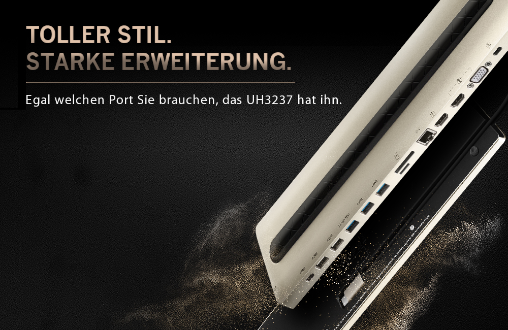 Erweiterung kann jetzt elegant sein. Das UH3237 ist ein elegantes Meisterwerk, exquisit aus massivem Aluminium gefertigt und mit einem gold-schwarzen Premium Design versehen. Schlank, stilvoll und kraftvoll – alles in einem geschmiedet.