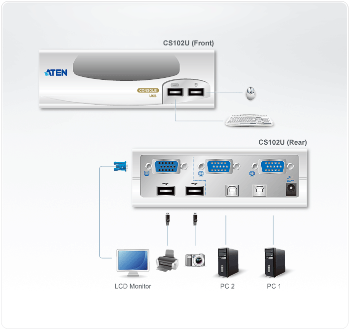 El CS102U es un Switch KVM con puerta USB. Controla 2 computadores desde una sola consola y pemite compartir 2 perifericos USB entre ellos. El usuario puede seleccionar un computador via botones del panel frontal. Es la más simple y convenente solución para el manejo de multiples computadores.