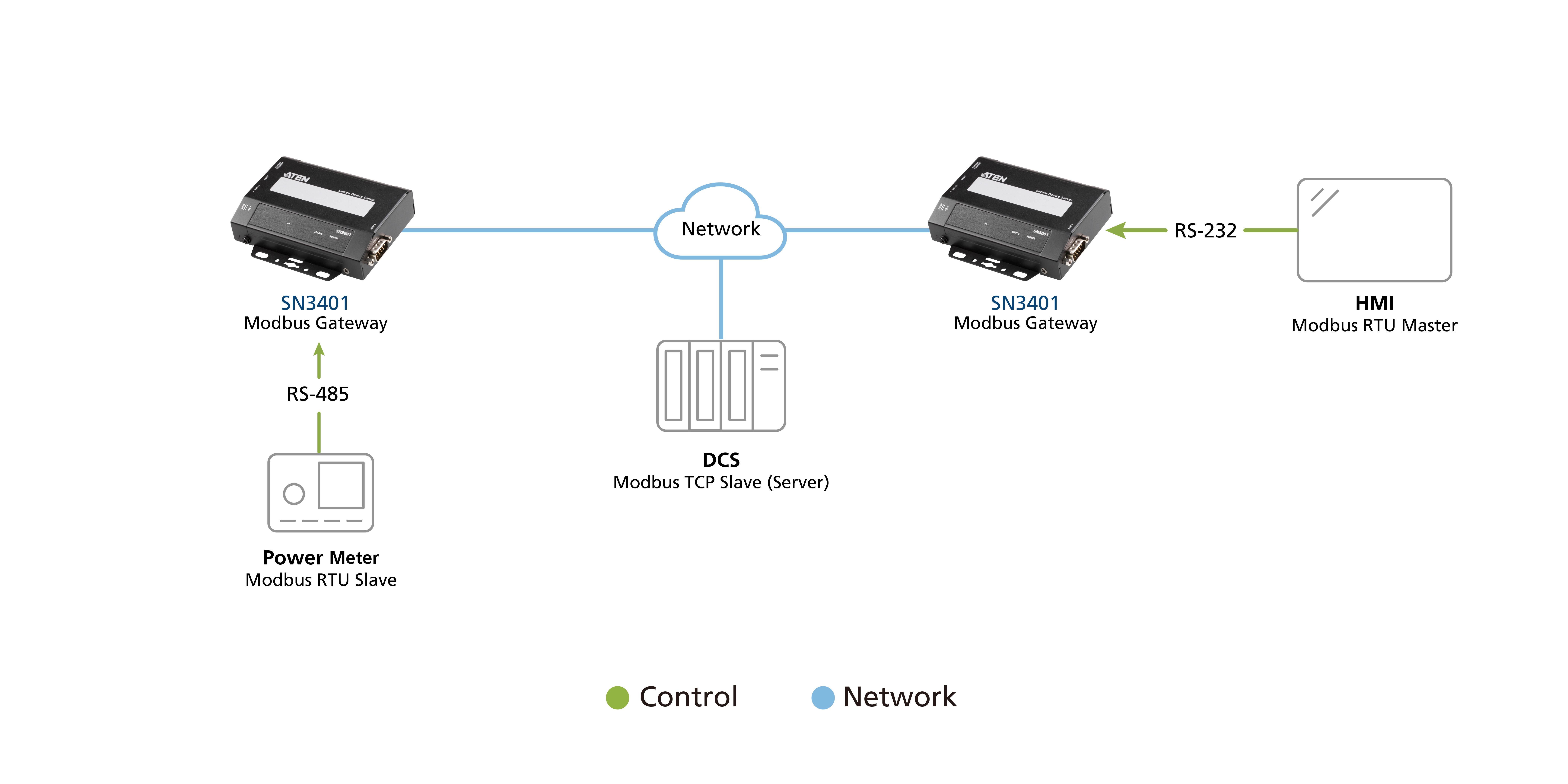 The SN3400 series serves as a versatile Modbus gateway, facilitating the conversion between Modbus TCP and Modbus RTU/ASCII protocols. Modbus serial slave devices can then be integrated effortlessly into an existing Modbus TCP network, enabling effective communication with Modbus TCP masters for enhanced network interoperability.