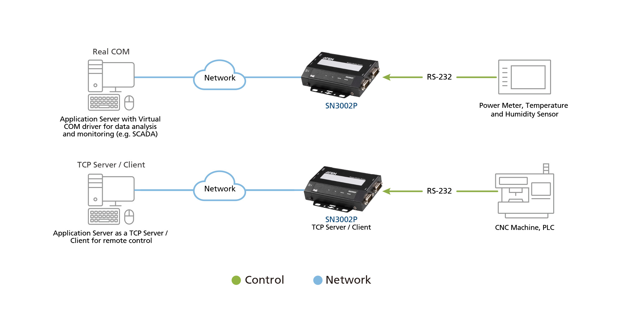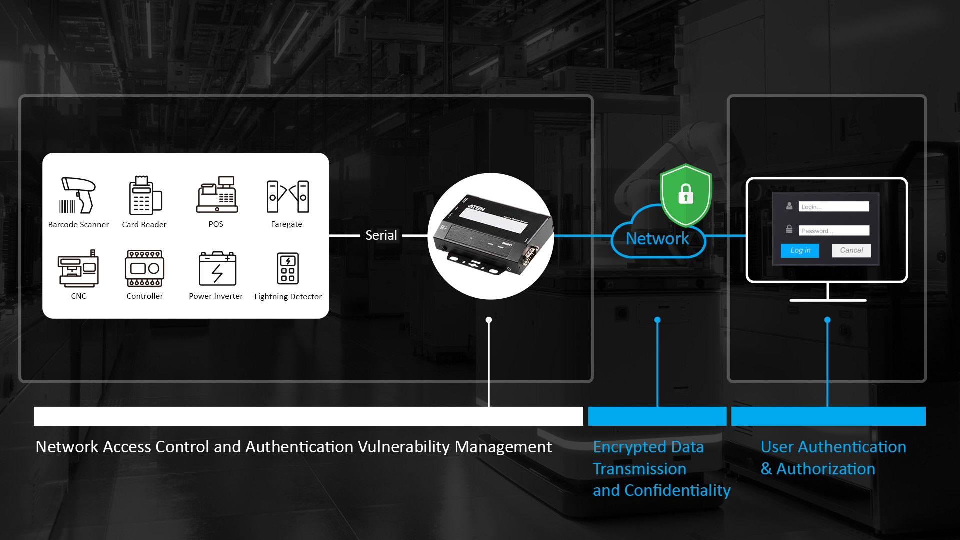 Secure Serial Device Servers address the challenges in industrial control processes by bridging legacy serial devices with modern Ethernet networks as communication gateways. Data is translated bidirectionally between serial and network transmissions, whether at remote or local sites, as long as they are within the same Ethernet network. This enables seamless data exchange, centralized monitoring, and remote device management between disparate technologies while ensuring secure integration of diverse industrial devices into interconnected IT systems for enhanced operational efficiency and informed decision-making.