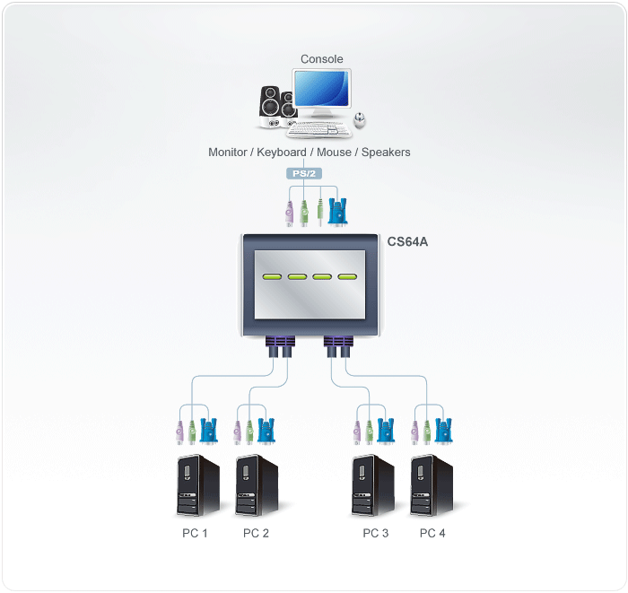 CS64A KVM Switch has a handy design integrating with 6 feet of cables and built-in PS/2. It can control 4 servers via a single console.
