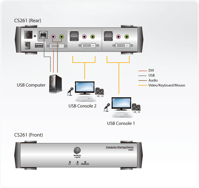 The CS261 is ideal for small office environments. All programs, files and resources on the connected computer can be accessed and shared by the two users without the complexity and expense of setting up a network. Users operate the computer on a one by one basis with an optional security feature that can block the video and audio of the console that is not in use.