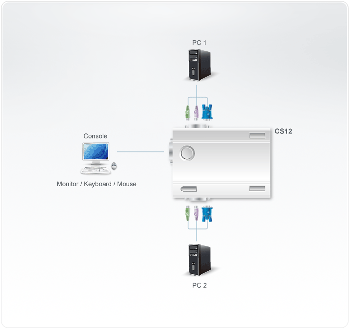 CS12 is a KVM Switch with built-in PS/2. It can control 2 servers via a single console and allows users to switch between computers via the buttons on the upper side of the switch or the hotkey configuration on the console keyboard. It is the simplest and most convenient solution for multi-computer management.