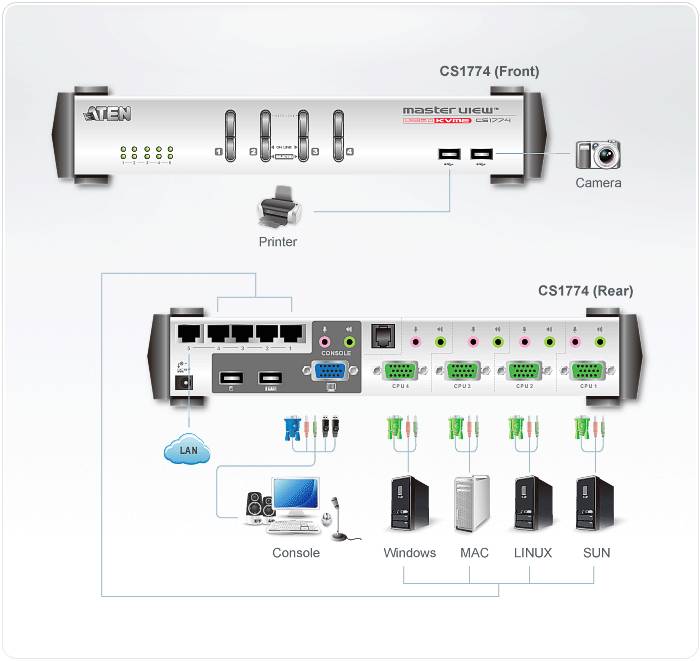 CS1774 is a multi-computer KVM Switch with built-in 3-in-1 (KVM Switch, USB 2.0 and Ethernet) function. It can simultaneously control 4 servers via a set of USB keyboard, mouse, and monitor. Moreover, the built-in USB and Ethernet Switch ports can rapidly access USB peripheral devices and share Internet resources at ease.