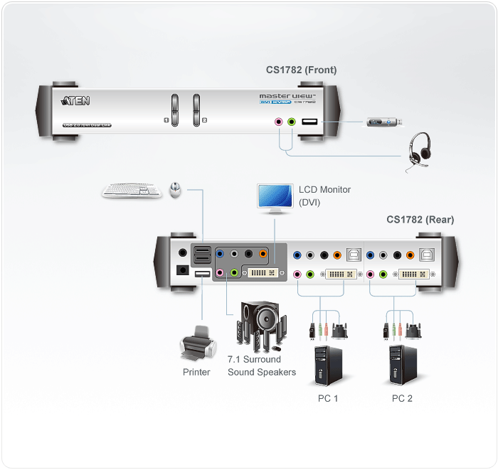 The CS1782 DVI KVMP Switch charts a revolutionary new direction in KVM switch functionality by combining a 2-port KVM switch with a 2-port USB 2.0 hub at the same time as providing an interface for a DVI monitor and 7.1 channel surround sound support.