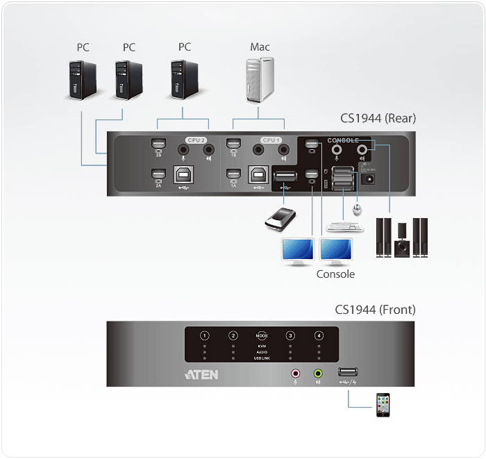 The CS1944 further improves on previous KVM designs with the latest Mini-DisplayPort and Mini-TOSLINK connectors. It also provides the capability of digital video & audio with reliable Ultra high resolution, vivid picture quality, surround sound with SPDIF connections.