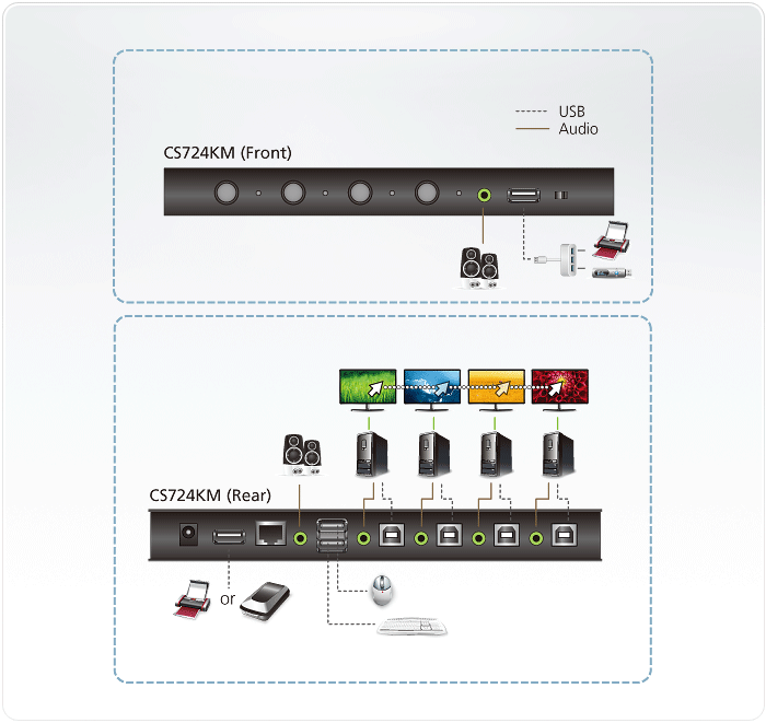 The CS724KM is a 4-Port USB KM Switch that enables users to control up to 4 computers with a single keyboard and mouse. Two switches can be daisy-chained to enable control of up to 8 computers from a single console.
