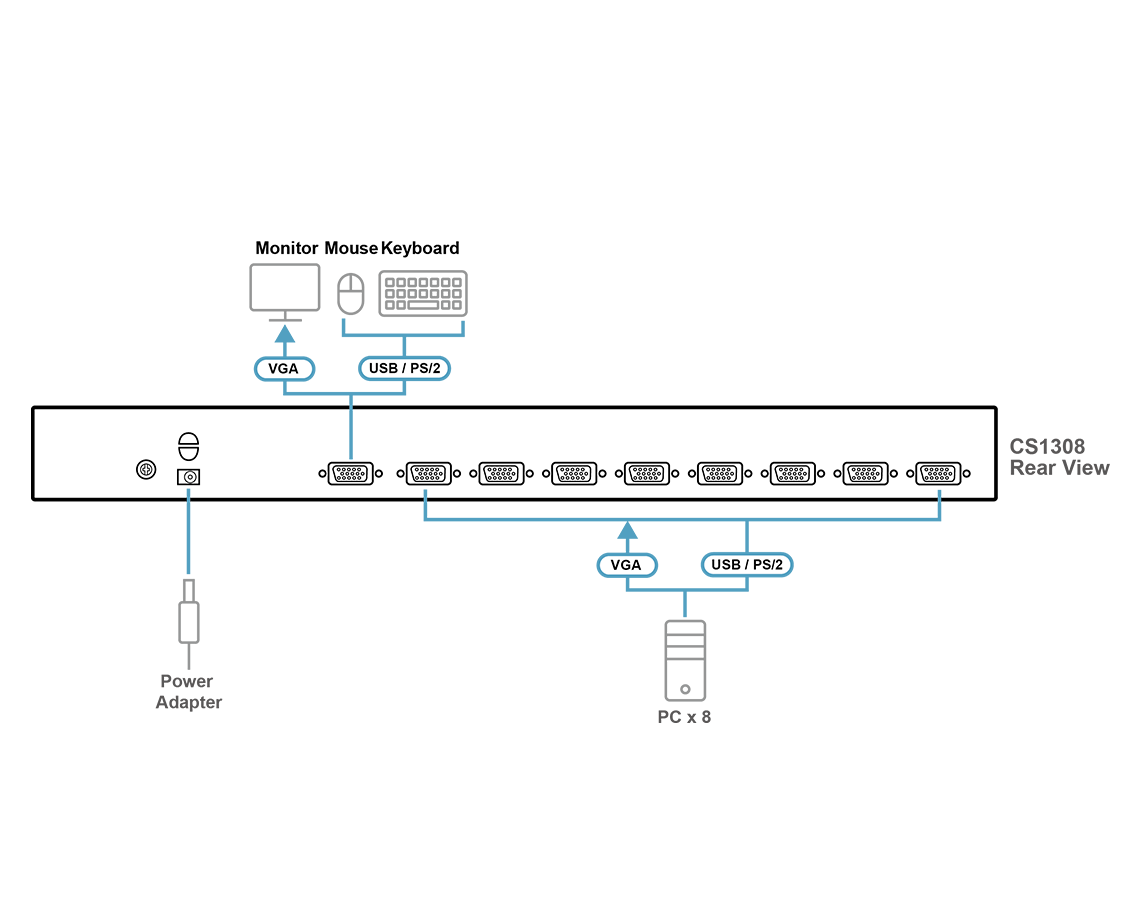 The CS1308 is a 8-Port USB-PS/2 KVM switch (Dual Interface). You're able to control up to 64 Computers from a single console (keyboard, mouse, and monitor).