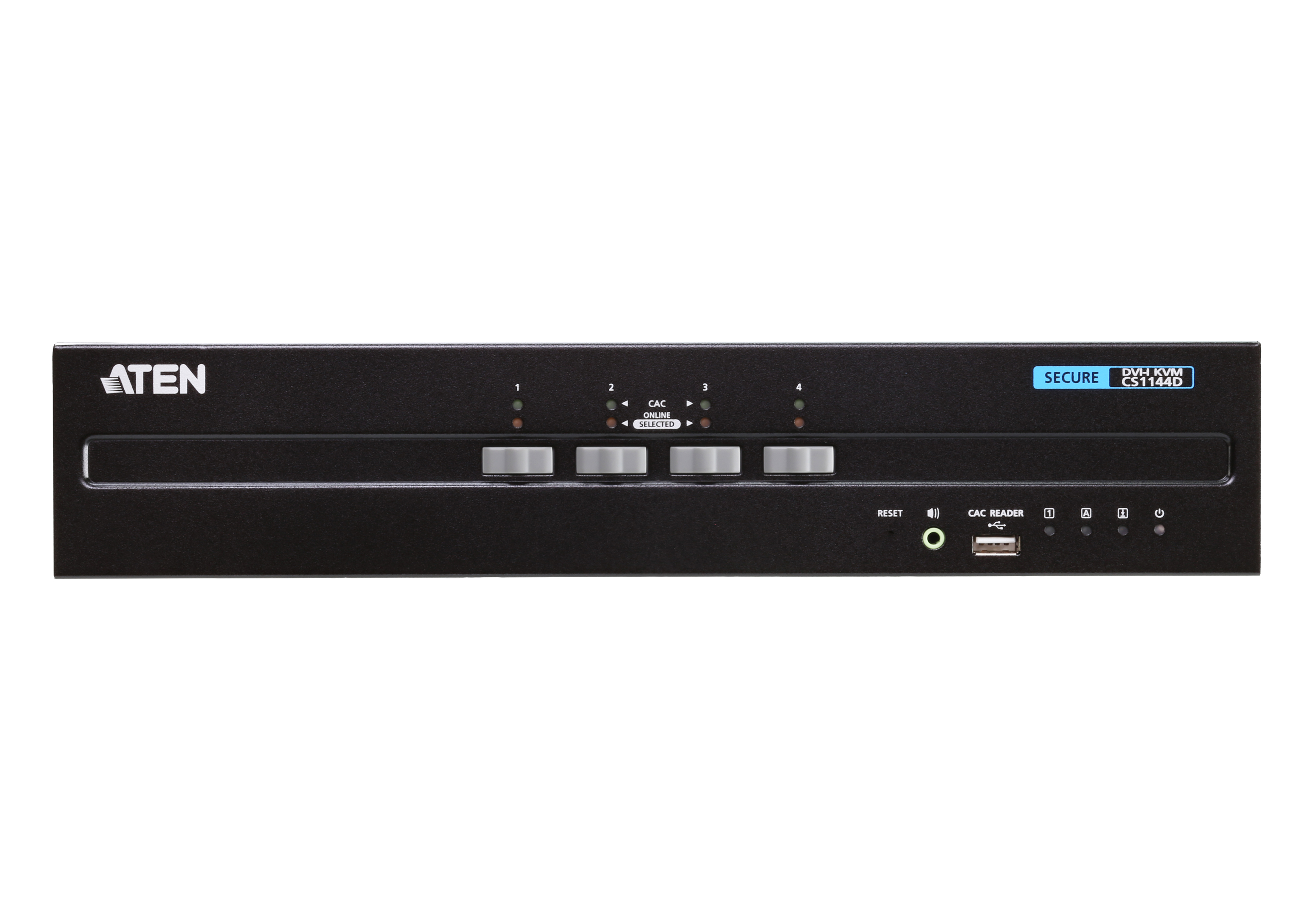 ATEN PSS PP v3.0 Secure KVM Switch (CS1144D) provides isolation between computer sources and peripherals while sharing a single keyboard, mouse, monitor, speaker set, and Common Access Card (CAC) reader between connected computers of various security classifications. Compliance with PSS PP v3.0 ensures peripheral sharing capabilities provide maximum user data security when switching port focus, preventing unauthorized data flows or leakage between connected sources. Key protections include isolation and unidirectional data flow, restricted peripheral connectivity and filtering, user data protection, configurable device filtering and management, and always-on tamper-proof design, keeping sensitive assets isolated and providing advanced security and a