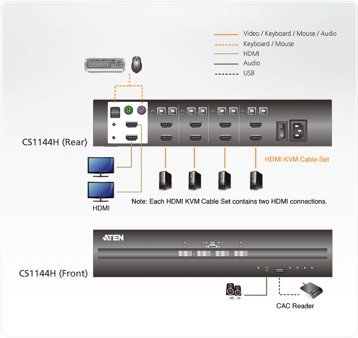 ATEN PSS PP v3.0 Secure KVM Switch (CS1144H) provides isolation between computer sources and peripherals while sharing a single keyboard, mouse, monitor, speaker set, and Common Access Card (CAC) reader between connected computers of various security classifications. Compliance with PSS PP v3.0 ensures peripheral sharing capabilities provide maximum user data security when switching port focus, preventing unauthorized data flows or leakage between connected sources. Key protections include isolation and unidirectional data flow, restricted peripheral connectivity and filtering, user data protection, configurable device filtering and management, and always-on tamper-proof design, keeping sensitive assets isolated and providing advanced security and a