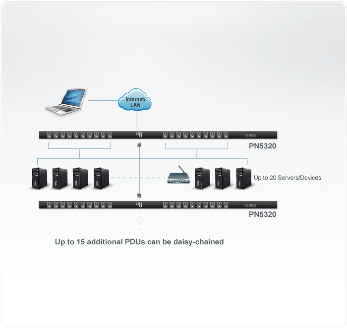 The PN5320 can be daisy-chained to manage even more devices, so your server room management can expand in step with your company's growth. For ease of management, when PDUs are deployed in conjunction with other ALTUSEN products*, administrators can access them all from the same user interface. When a PDU is integrated in a CC (Control Center Over the NET™) management software installation, the power outlet of an IT device can be associated with its KVM port and displayed on the same CC web page. This allows IT administrators to completely control an IT device from a single user interface.