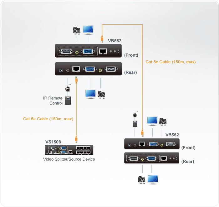 The VB552 VGA Over Cat 5 Repeater +Audio is an audio/video signal extension device which is compatible with ATEN Cat 5 Audio/Video splitters. The VB552 extends the audio/video transmission range an extra 150m over Cat 5e (or higher) cables. The use of an additional repeater means the audio/video signals can be transmitted over even longer distances, up to 450m.