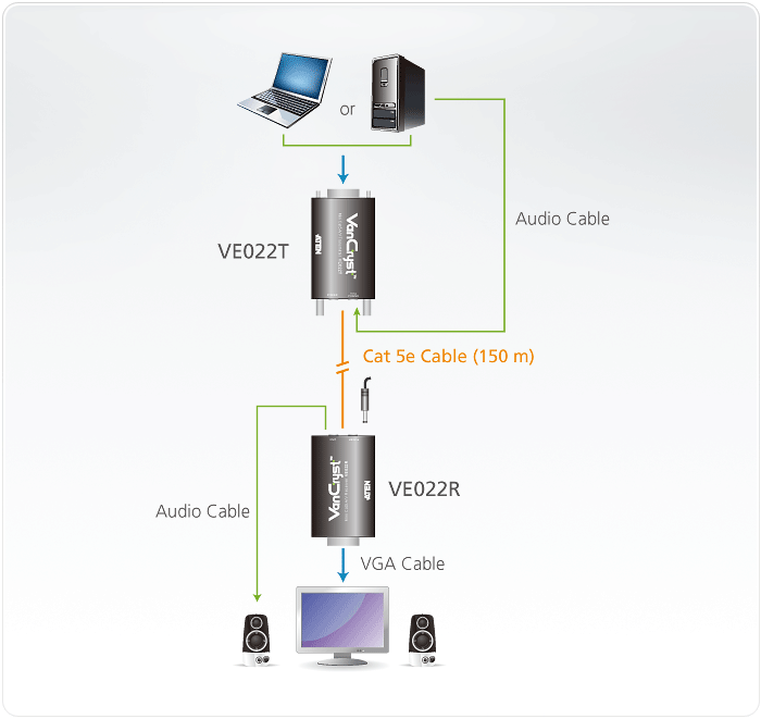 The VE022 Mini Cat 5 A/V Extender allows you to extend the distance between your video/audio source and display devices by as much as 150 meters, using a Cat 5e cable, providing an easy way to replace heavy and expensive VGA cables. With hot-plugging support, you can quickly add or remove the VE022 transmitter/receiver connected to the source/display device without having to power down devices.