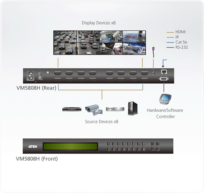 The VM5808H is an ideal solution for applications that require multiple HDMI displays with multiple HDMI sources to be conveniently setup in multiple locations, such as for stage presentations, competitions, control centers, and installations that require real-time reports.