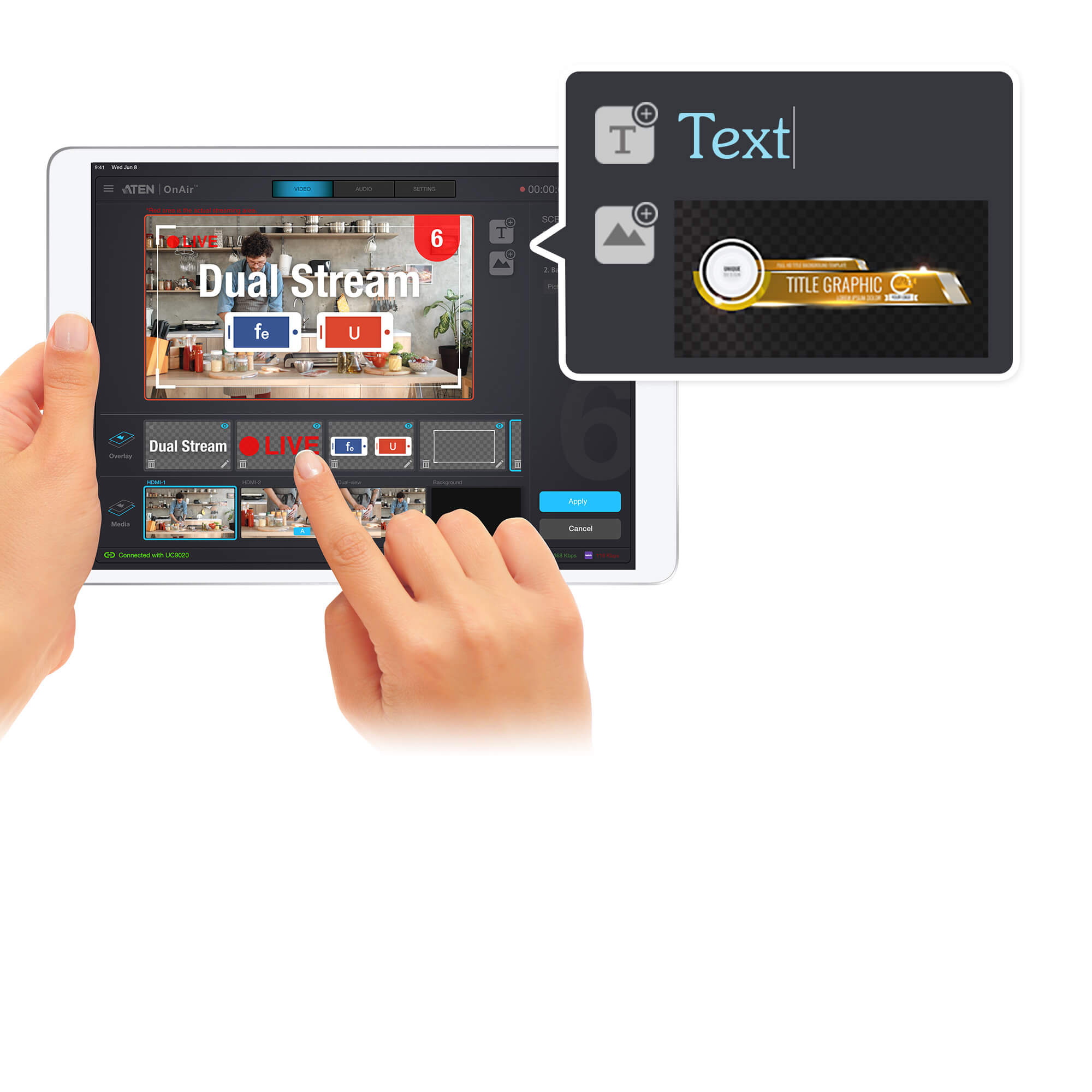 Create a professional, dynamic multi-camera production with the UC9020 StreamLIVE™ HD. It is the simplest, all-in-one TV-quality livestreaming studio that is small in size and big on capability. Everything you need for livestreaming is ready to just plug-n-play. No computer, monitor, or complicated software settings necessary. Capture, stream, and switch between two full HD video inputs over the Internet and instantly take your video production to the next level.
