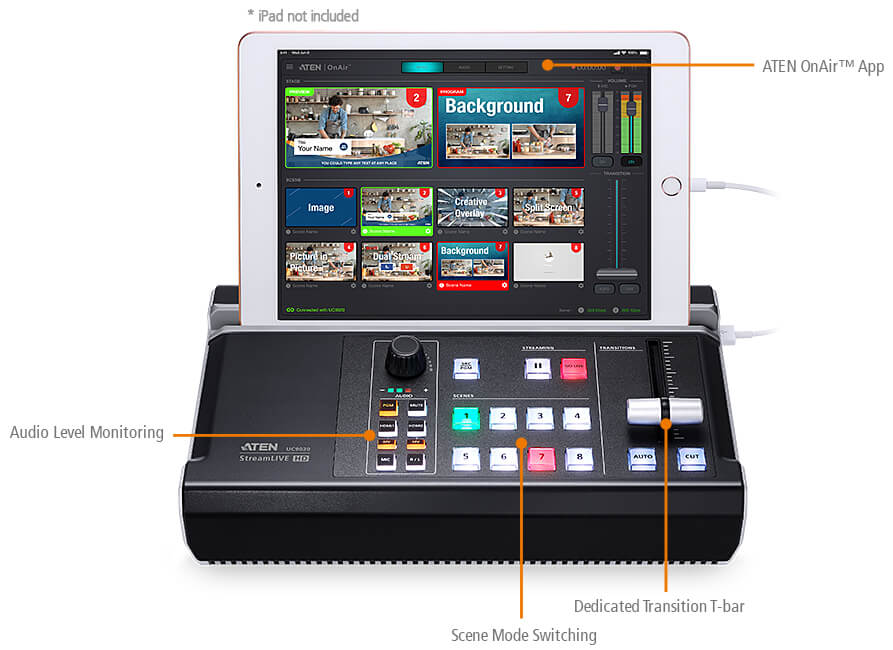 - Receives clean HDMI camera feed via ATEN OnAir Cam app – the app helps capture the iPhone / iPad camera feed and turn it into a clean 1080p @ 60 Hz HDMI video source without on-screen icons or overlays for the StreamLIVE HD's usage