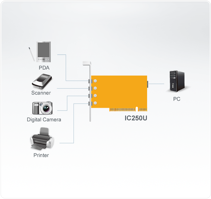 IC250U is a PCI card with 5 USB ports. It supports hot plug and PnP.
