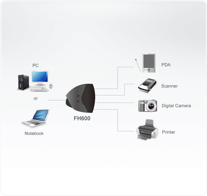 The FH600 IEEE 1394 Hubs provide six 1394a compliant ports that support data transfer rates of 100.200,and 400 Mbps. Each port automatically switches to the highest speed that the peripheral supports. Each IEEE 1394 peripheral connects externally;simply plug in the cables. Configuration is automatic;there is no need to specify memory addresses,IRQ assignments,device IDs, or even plug in terminators.The advantages of hot pluggable connectivity and non interrupting daisy chaining has distinguished FireWire ade a household standard.