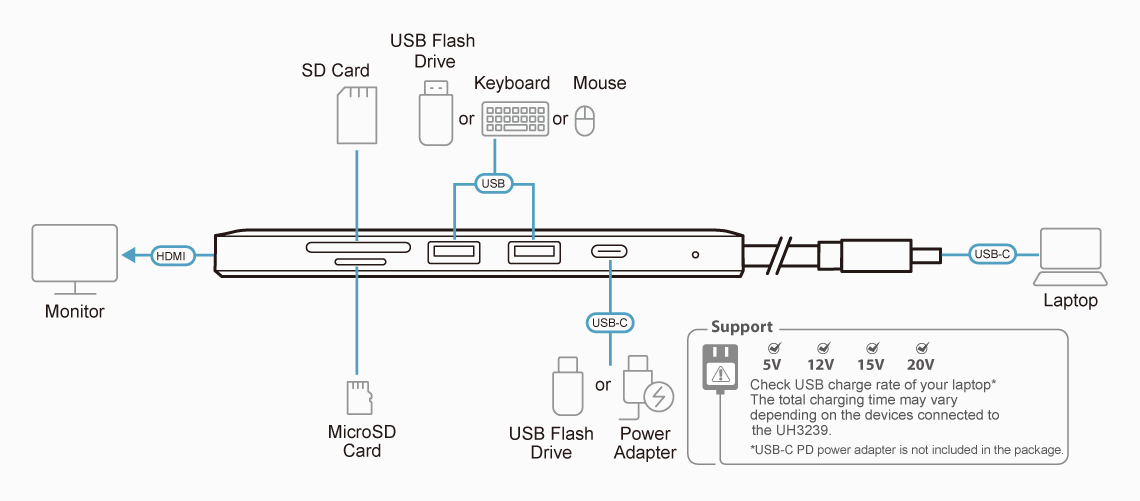 The UH3239 USB-C Multiport Mini Dock with Power Pass-Through is a portable, versatile and flexible 6-in-1 adapter for USB-C PCs or laptops. The durable aluminum enclosure ships with dual USB 3.2 Type-A ports, a USB-C PD port, an HDMI port along with an SD card and a MicroSD card slots. It covers users' peripheral connectivity demands while allowing power delivery to the connected USB-C device. It supports resolutions up to 4K HDMI (3840 x 2160 @ 30Hz) to ensure that every detail of the video is displayed in the crisp and sharp UHD resolution on the 4K graphics-supported laptop. Besides, its 2 USB 3.2 Gen 1 Type-A ports guarantee effective communication with peripherals at a decent 5 Gbps transmission speed. Thanks to the USB-C PD port, the UH3239 can provide power or charge the external devices, and hence, there will be no more tangled data cables on the desk.