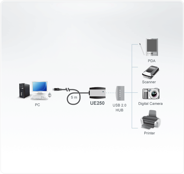 The UE250 allows users to extend the distance between the computer and USB devices up to 5m via the dynamic extension cord. USB signals transmitted through them to maintain optimal signal integrity and meet the USB 2.0 standard.
