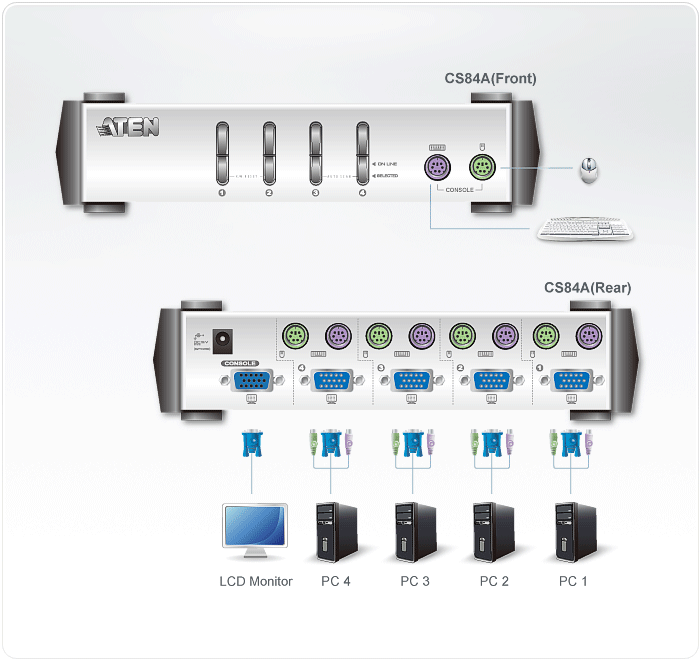 Le CS84A est un commutateur KVM avec port PS/2 intégré sur chacun des panneaux avant et arrière. Il peut contrôler 4 serveurs par le biais d’une seule console et permet aux utilisateurs de basculer d’un ordinateur à l’autre à l’aide des boutons situés sur le panneau avant du commutateur lui-même ou de raccourcis claviers sur le clavier. C’est la solution la plus simple et la plus pratique pour la gestion de plusieurs ordinateurs.
