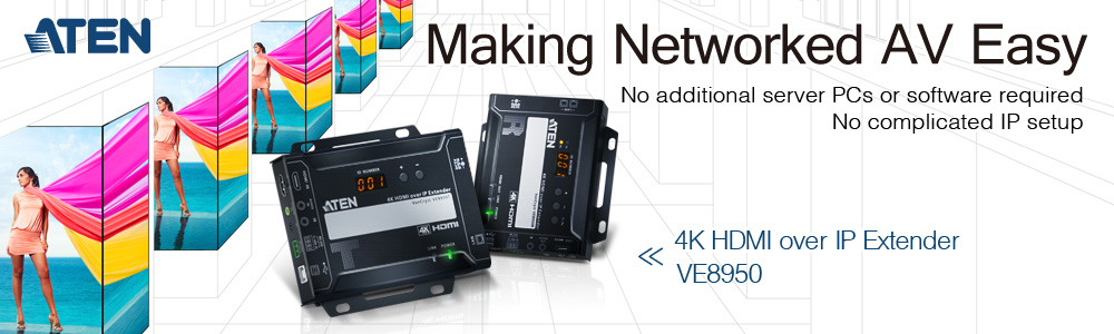 Taipei, Taiwan (Nov 30, 2017) – ATEN, the leading provider of IT connectivity and total management solutions, today introduced its first professional A/V over IP solution, the VE8900/VE8950 Video over IP Extender. The ATEN VE8950 delivers visually lossless 4K @ 30Hz (4:4:4) AV signals with low latency over long distances via a standard Gigabit network, while the VE8900 supports resolutions up to 1080p. Representing ATEN’s first foray into the A/V over IP market, the VE8900/VE8950 also supports video walls function with simple layout control, which provides an effective, easy-to-use, and economical solution to meet today’s