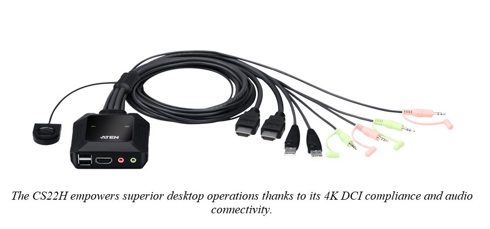 UK (February 1, 2021) – ATEN International, the leading provider of AV/IT connectivity and management solutions, today launches the CS22H 2-Port USB 4K HDMI Cable KVM Switch with Remote Port Selector. The CS22H is a control unit that allows for instant access to two computers from a single USB and HDMI console (keyboard, video, and mouse) with audio. With this cable KVM, users can quickly and effortlessly switch between two HDMI computers using a convenient remote port selector pushbutton without the need to install software or configure devices. The compact, bus-powered CS22H helps create an organized desktop with reduced cable clutter and delivers superior video quality up to 4K DCI (4096 x 2160 @ 60Hz) for optimum visuals that enhance workflow in office applications and graphic design and provide the best in entertainment.