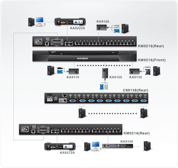 ALTUSEN matrix KVM switches from ATEN provide a revolutionary new way for IT administrators to maximize efficiency while managing mission-critical servers. Designed for corporate server rooms, matrix KVM switches feature multiplatform support both for servers and consoles. Matrix KVM switches allow a diversity of consoles to independently and simultaneously access servers. By combining ALTUSEN KVM adapter cables and console modules with a matrix KVM switch, previously incompatible console and server platforms interface flawlessly. And for the continually expanding server room, these KVM switches cascade and daisy chain to accommodate thousands of servers.