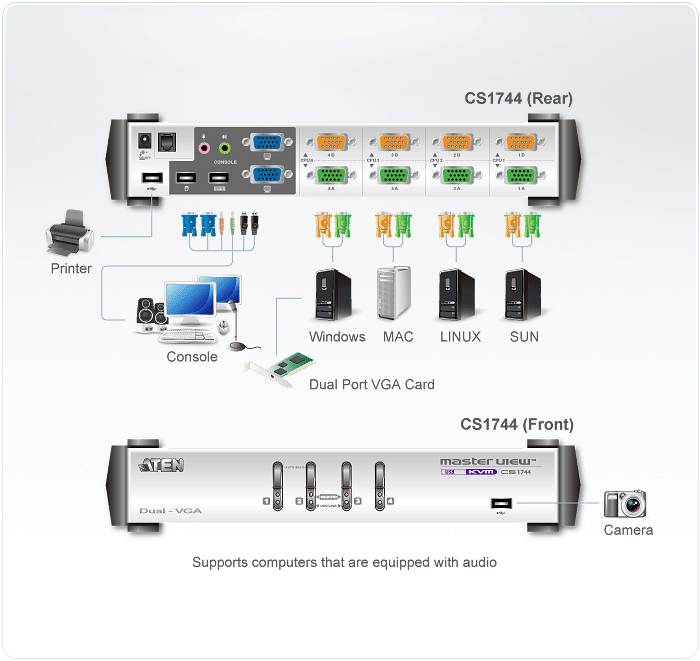 CS1744 KVM Switch integrates functions of video signal dual output and USB KVM switches. It allows a computer with dual-screen support to pair with two VGA/SVGA/Multisync displays via a USB keyboard and mouse. Furthermore, CS1744 provides 1 USB port on each of the front and rear panels, allowing each server to share any USB peripheral device that is connected to this HUB.