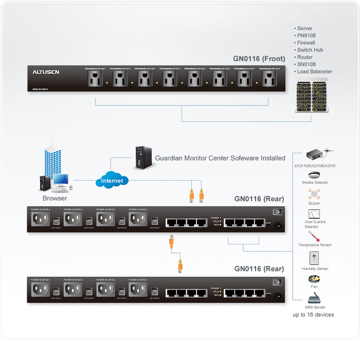 The GN0116 Guardian Over the NET™ is designed to offer remote environment monitoring and management of your server room or critical systems. With its remote control and logical configuration features, powerful management capability and scalability, it enables you to build a safe and reliable environment for your server room or data center. An IT administrator is able to real-time monitor the status of the equipments or environment, identify and troubleshoot system problems at an early stage, thereby minimizing repair costs and guaranteeing 24/7 reliable server room/data center monitoring.