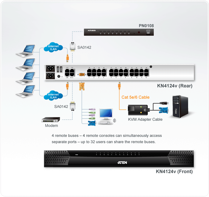 Aten´s new generation of KVM over IP switches - KN series allows local console access and remote over IP access for operators to monitor and access their entire data center over a network using a web-based browser. In addition, they offer out-of-band access with external modem support for BIOS-level troubleshooting when the network is down.