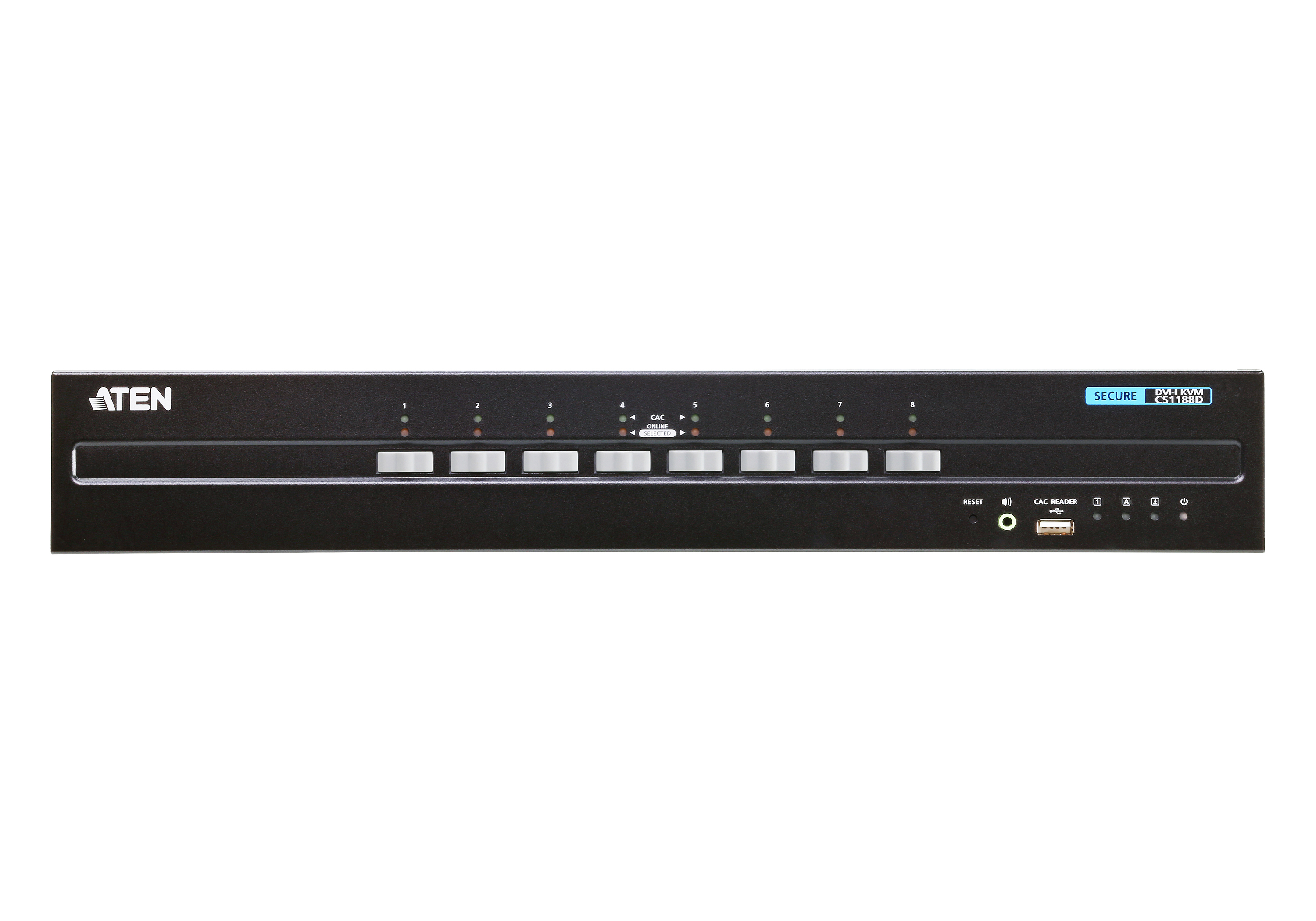 ATEN PSS PP v3.0 Secure KVM Switch (CS1188D) provides isolation between computer sources and peripherals while sharing a single keyboard, mouse, monitor, speaker set, and Common Access Card (CAC) reader between connected computers of various security classifications. Compliance with PSS PP v3.0 ensures peripheral sharing capabilities provide maximum user data security when switching port focus, preventing unauthorized data flows or leakage between connected sources. Key protections include isolation and unidirectional data flow, restricted peripheral connectivity and filtering, user data protection, configurable device filtering and management, and always-on tamper-proof design, keeping sensitive assets isolated and providing advanced security and a
