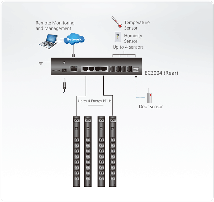 The EC2004 Energy Box has four Energy Sensor ports (2 Current Energy Sensors, 2 Current/Voltage Energy Sensors) to connect to four Energy PDU modules, four Environment Sensor ports and one 4-pin dry contact Rack Door Sensor port, these external sensors can monitor environmental conditions and rack door access. Each environmental sensor can provide measured readings of temperature, humidity, and differential pressure from separate areas of a room, giving a wide range of monitoring and protection you need.