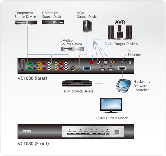 The VC1080 carries a high-performing scaling engine that converts the video resolution to give you the best image quality. It is equipped with a next generation color engine that automatically adjusts and enhances picture quality. It features a superior 3D de-interlacer function for smooth video playback. The VC1080 uses Smart Video Display technology to match the display’s native resolution, as well as ATEN’s Video DynaSync, which optimizes the video display without any delay when switching devices. The VC1080 also integrates superior video noise reduction and comb filter for maximum viewing comfort.