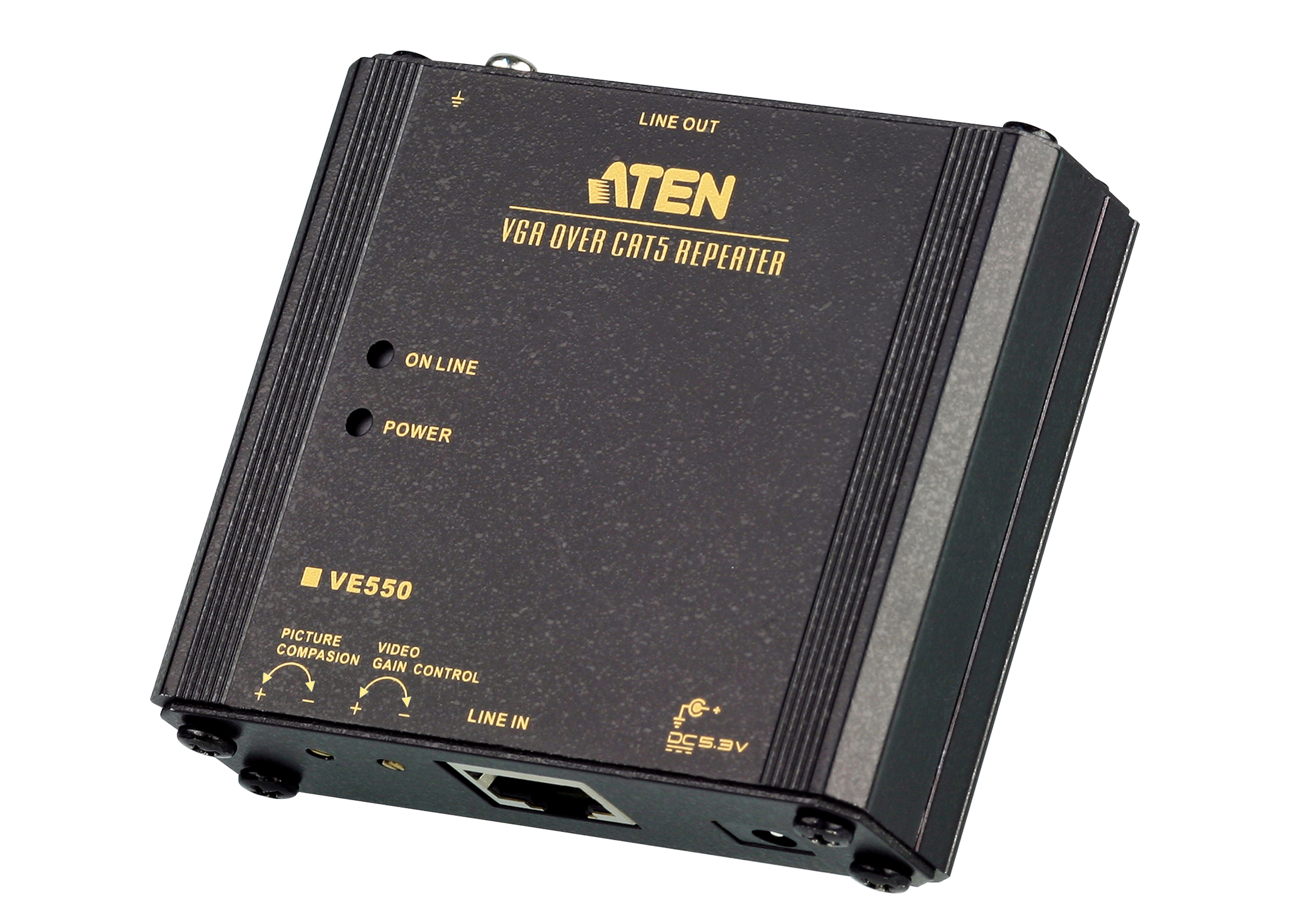 The VE550 VGA Over Cat 5 Repeater is a video signal extension device which is compatible with ATEN KVM Extenders, Video Extenders, and Cat 5 KVM Switches. The VE550 extends the video transmission range up to twice the original distance over Cat 5e cables. Moreover, using an additional repeater, VGA signals can be transmitted over even longer distances.