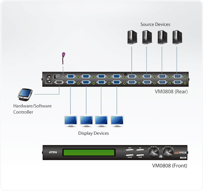 * Note: The VM0808 AP and GUI operation instructions can be downloaded from the ATEN website (ru.aten.com)
