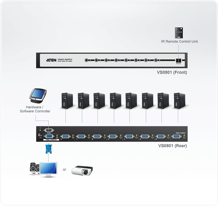 - Quick and easy switching between VGA/Audio sources via front panel pushbuttons or IR remote control