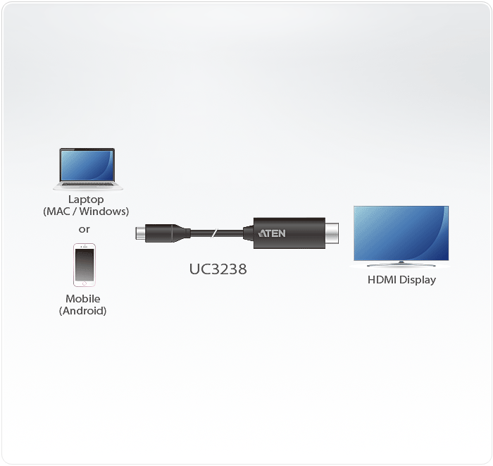 UC3238 is a seamless, single cable solution for connecting from USB-C laptop to an HDMI display, allowing for tidy installation and cable management without the needs for additional dongles or HDMI extension cables.