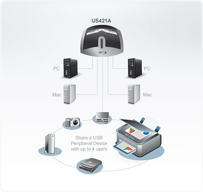 The US421A is a 4-port USB 2.0 Peripheral Switch that allows up to 4 computers to share the use of a single USB peripheral device (such as a printer, scanner, mass storage drive, etc.) on a one-at-a-time basis.
