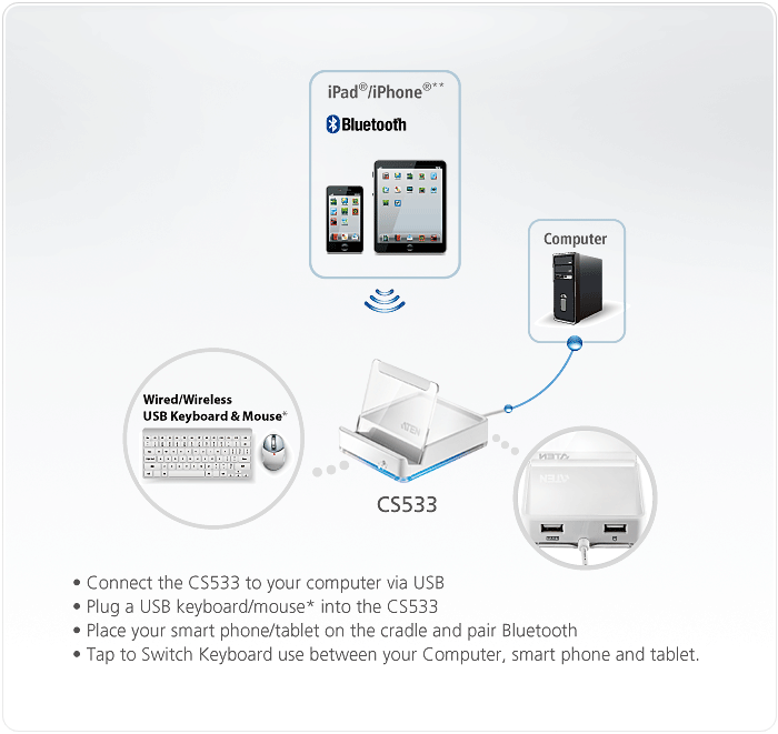 - Quick switch access to the computer and Bluetooth devices via hotkey